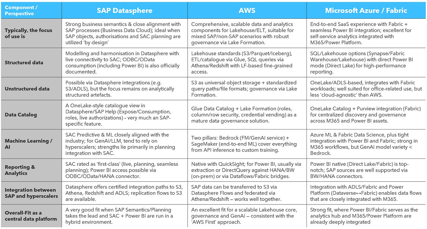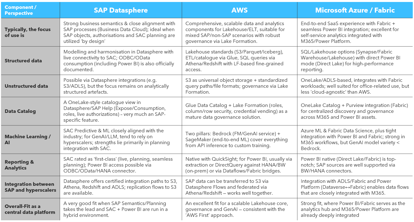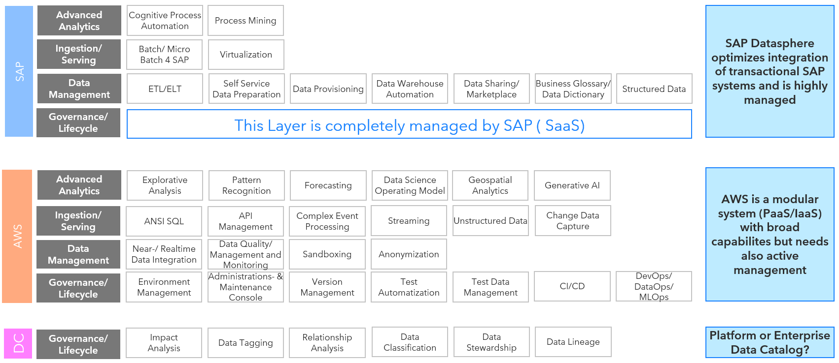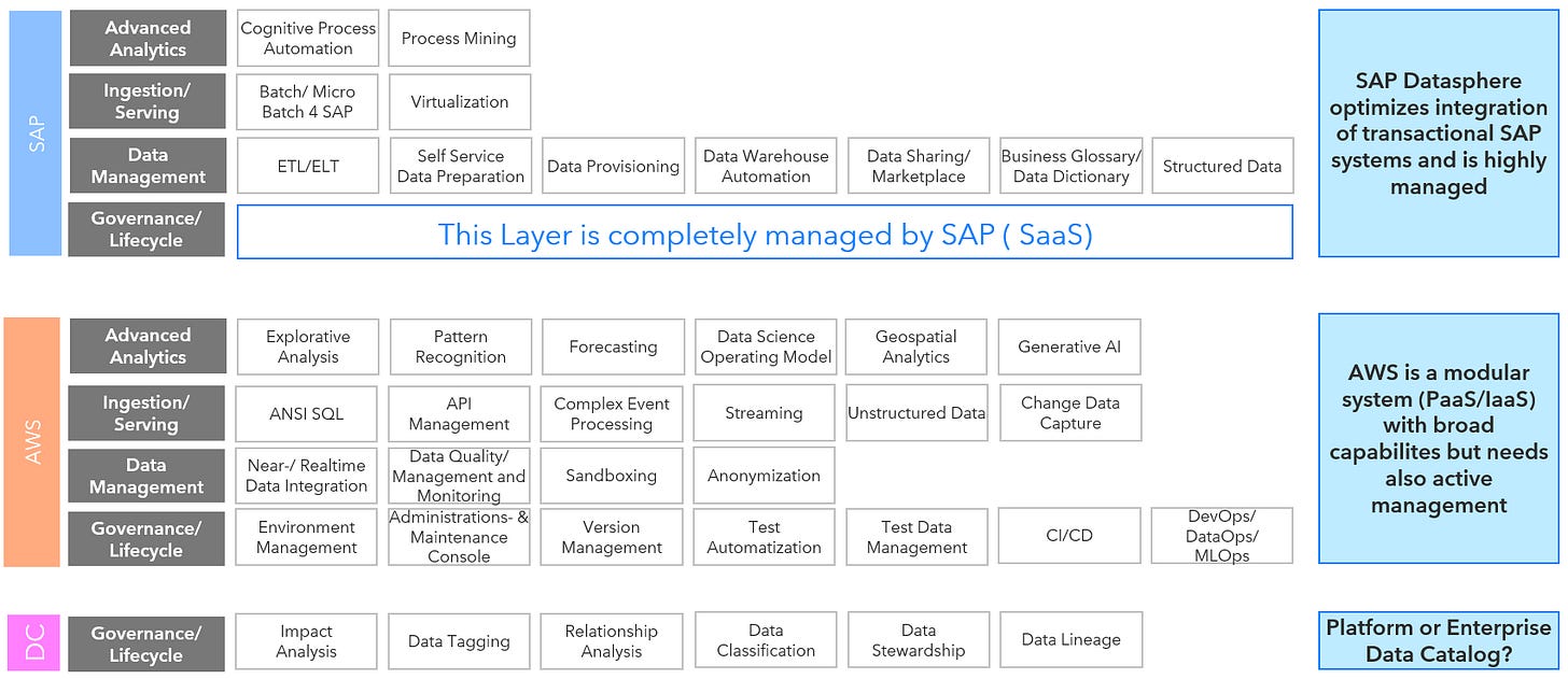 Currently the concept is focussed on SAP, with SAP Datasphere as successor of the former SAP BW and AWS, the cloud platform used to build applications but including also data management / local data platform approaches. If they work together, the have a good fit of prefered capabilities: