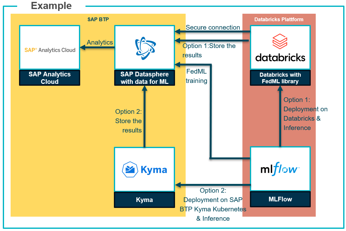 Some key aspects of this use case are having a federated scenario without duplicating the SAP data in Databricks. Data scientist works in a familiar Databricks notebook environment and ML models for new predictions can be provided in a Databricks or SAP Kyma environment.