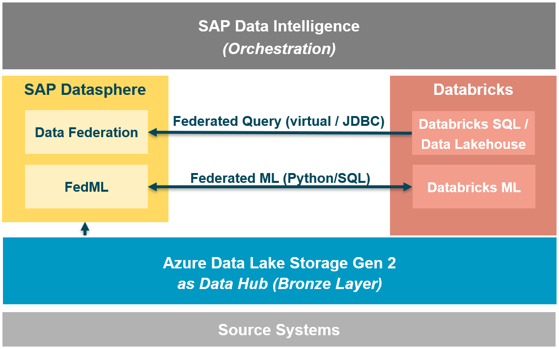 A general scenario for the integration can be seen in the following picture. There are several ways how SAP Datasphere (or similar for SAP BW) can play together. From an SAP perspective SAP can directly access the data lake (here Azure ADLS2), data can be orchestrated via SAP Data Intelligence (Cloud) or the connectivity and libraries can be used to create a data federation/data fabric approach by accessing the powerful Databricks engine and make use of there possibilities for accessing big data or federate machine learning.