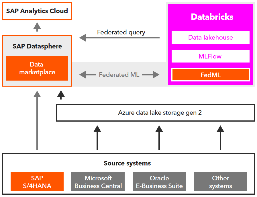 Data in SAP Datasphere comes virtually from S/4HANA, data in Databricks Data Lakehouse comes from other non-SAP systems and external sources.