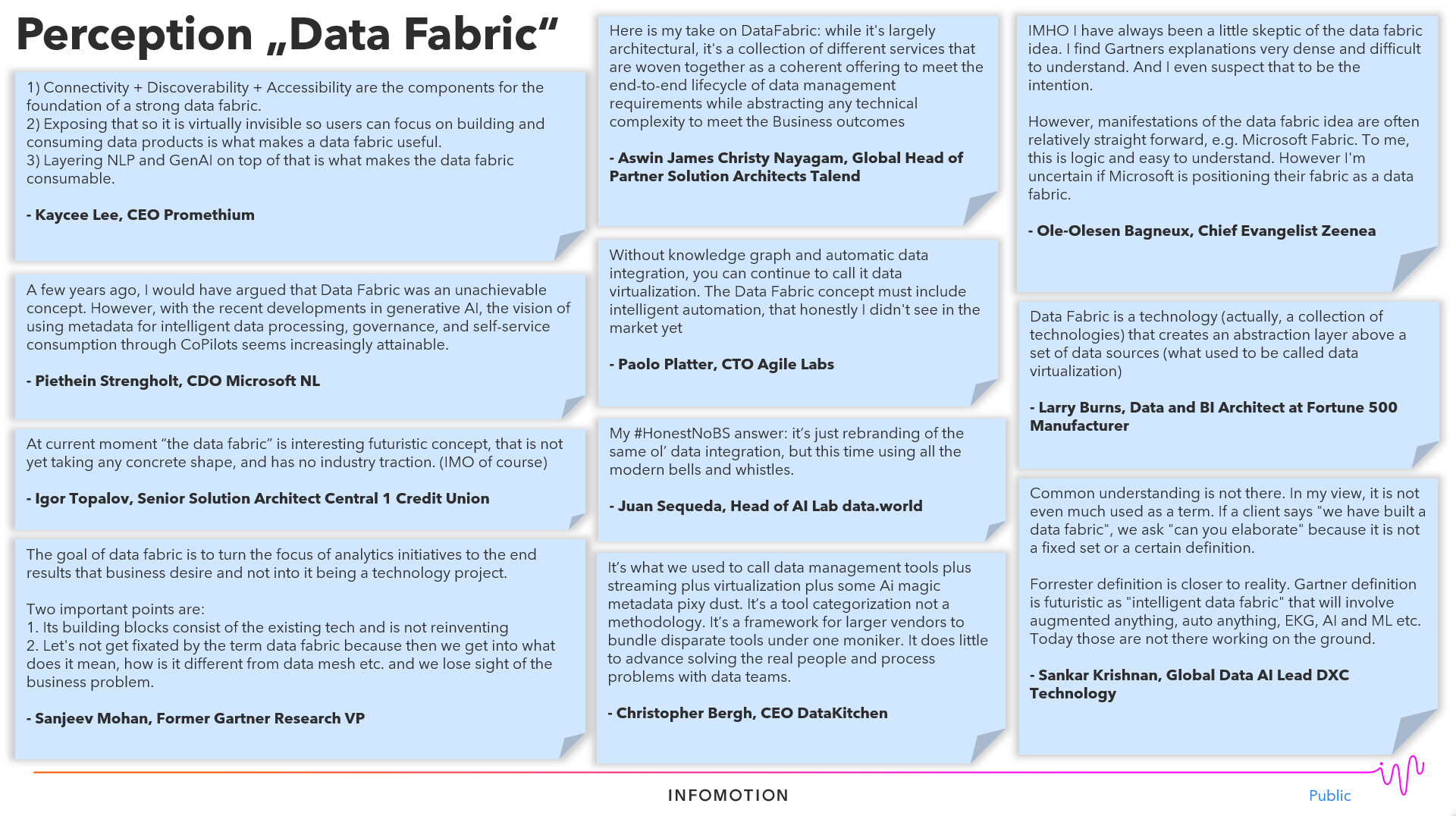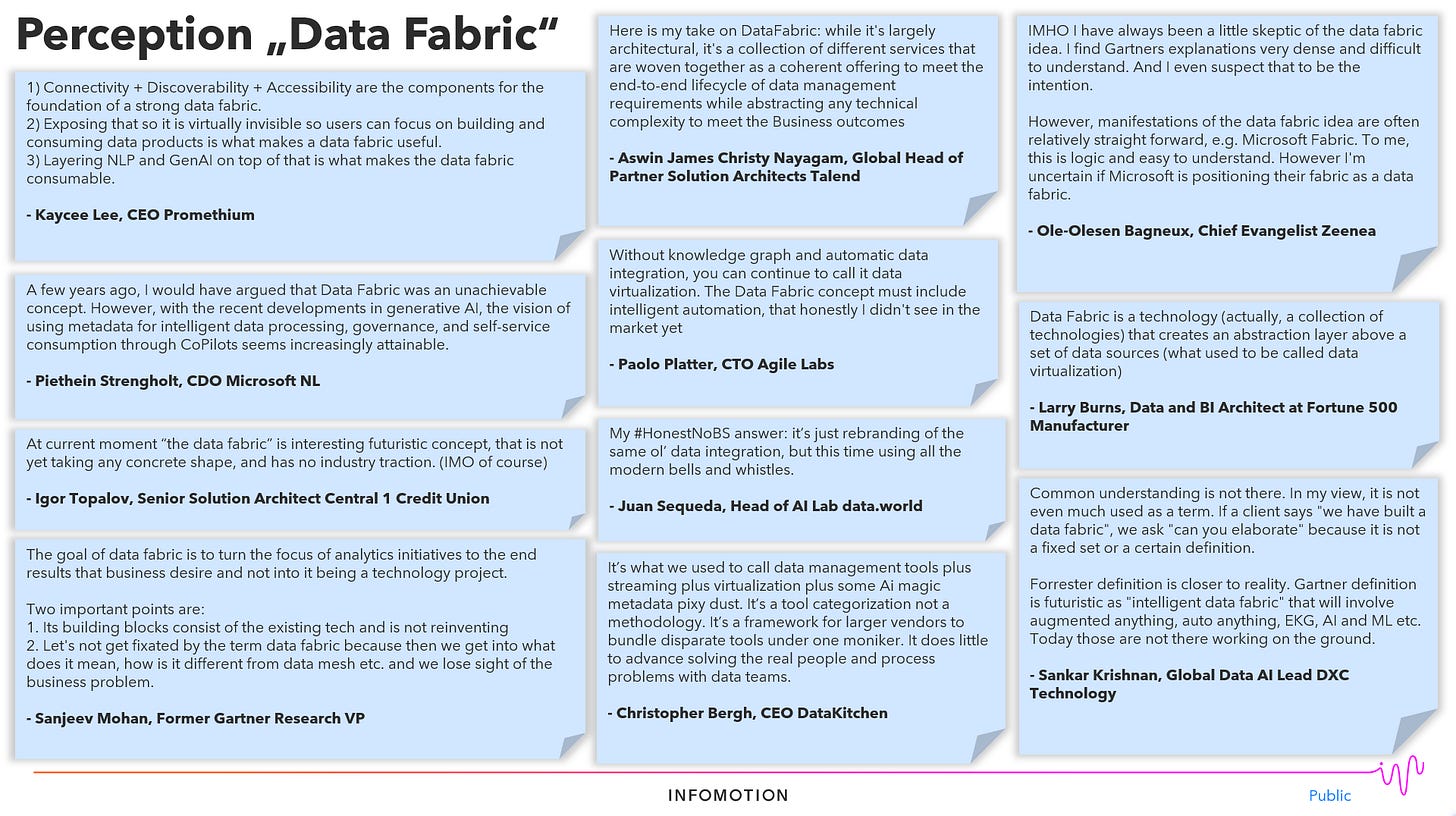 Today nothing is easier than to discuss your thoughts with the world. Therefore I posted my initial thoughts about what a Data Fabric is to LinkedIn, getting a lot of different perspectives on the topic: