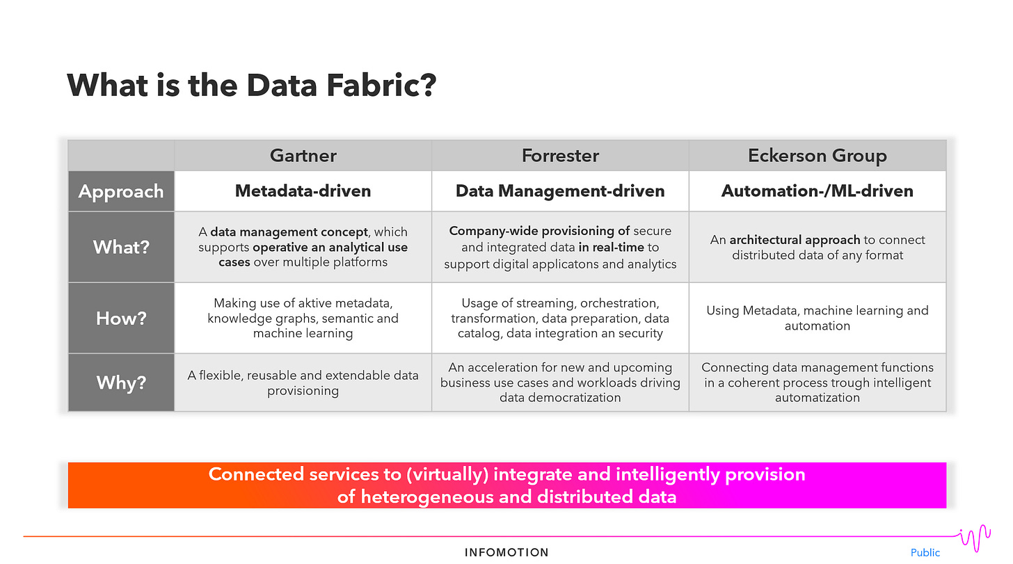As a result for myself I found a kind of working definition for Data Fabric - “Connected services to (virtually) connect and intelligently provision of heterogeneous and distributed data”.