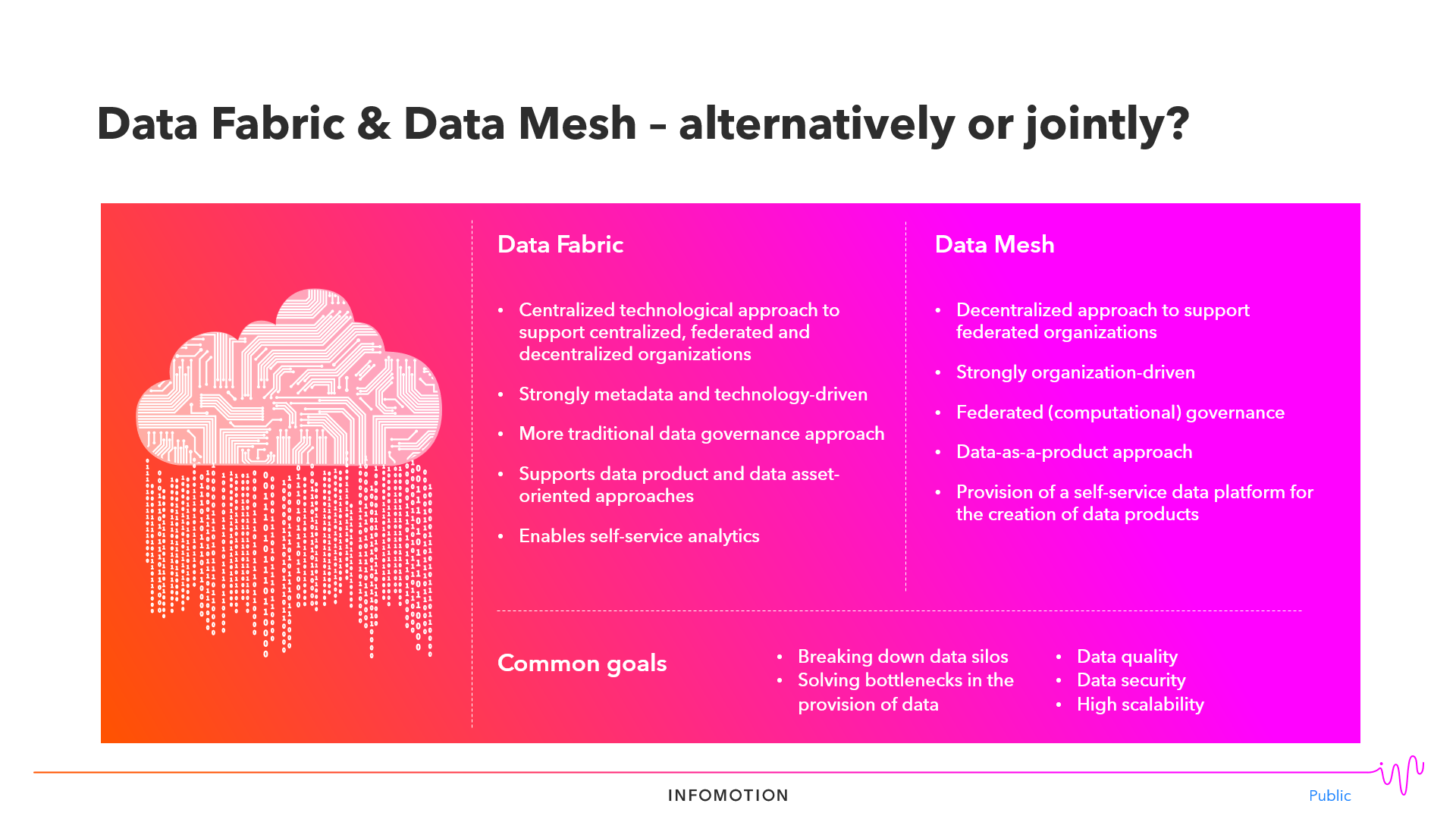 You will find many explanations about Data Mesh in the web. Here I put together the both approaches, what makes them unique, and the common goals they share: