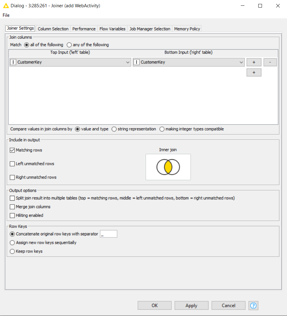 Different datasets are read, joined and transformed to provide the right data for the next steps of preparing the machine learning. The join is supported by a graphical representation and different parameters can be used to define output, key handling, performance: