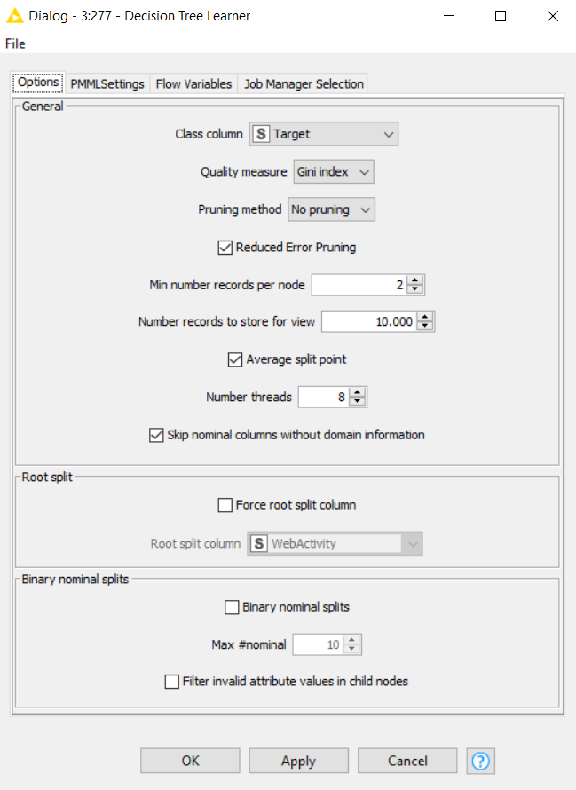 i.e. the distribution of values in the selected column is (approximately) retained in the output tables. You may optionally specify a fixed seed.To train the decision tree with the training data there are several parameters possible but most defining is the quality measure "Gini Index" and the "Gain Ratio". A explaination can be found here.
