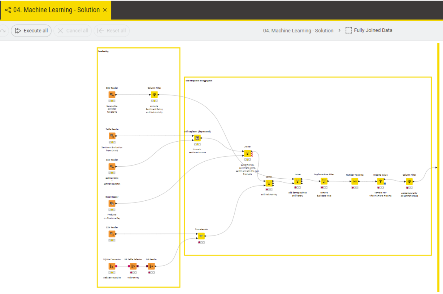 The first node of the workflow is the metanode “Fully Joined Data” which wraps the data preparation process: