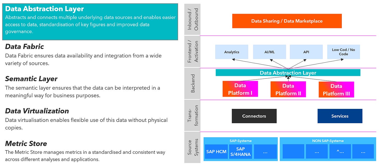 Depending on your requirements, budget and technical and organisational restrictions we can think into two direction. On is to think in what I would call “Data Abstraction Layer”. It is about making access to distributed data locations easier by connecting them. There are different ways to do that where “Data Fabric” from my opinion is the premium solution but maybe not always necessary. We should never forget, that Data Fabric can be a very complex technical approach.