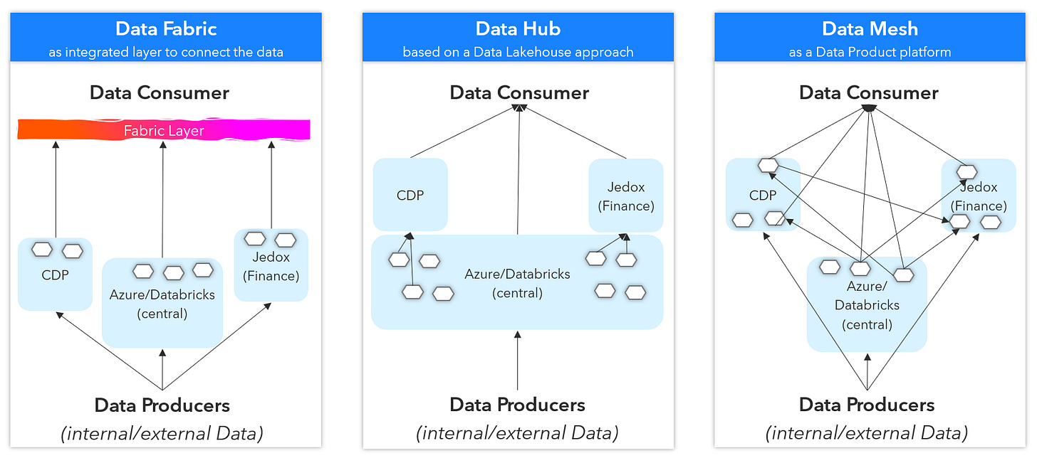 While Data Mesh already supports decentralized architectures, it can easily be combined with approaches like Data Fabric and Data Hub. While in Data Fabric data can be combined and provided from different data platforms, it sometimes comes to limitations through virtualization and when it comes to complex calculations or historizations of combines datasets. A Data Hub is a data distribution approach where Data Mesh can be used as a form of Data Hub or the Mesh is build upon a common data layer provided by the Data Hub in a multi-platform Data Mesh-approach.