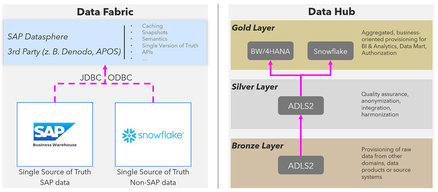 The two main platforms SAP BW/4HANA and Snowflake need same data and different approaches like direct data exchange, establishing an enterprise bus with Apache Kafka and others are discussed. On possible approach is to solve it via architectural thinking.