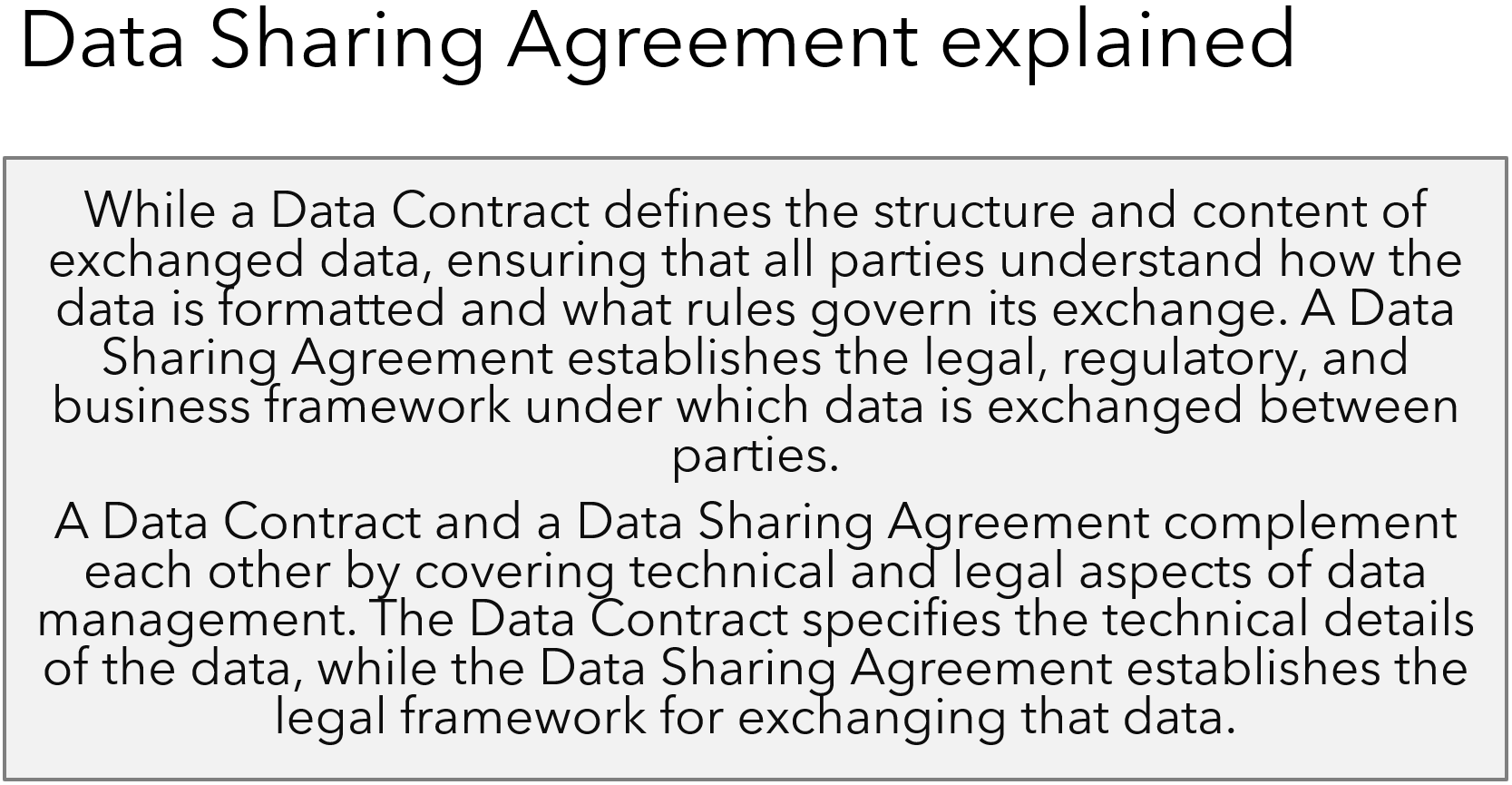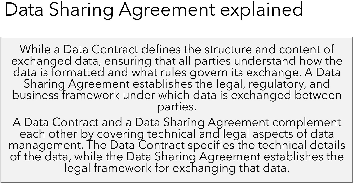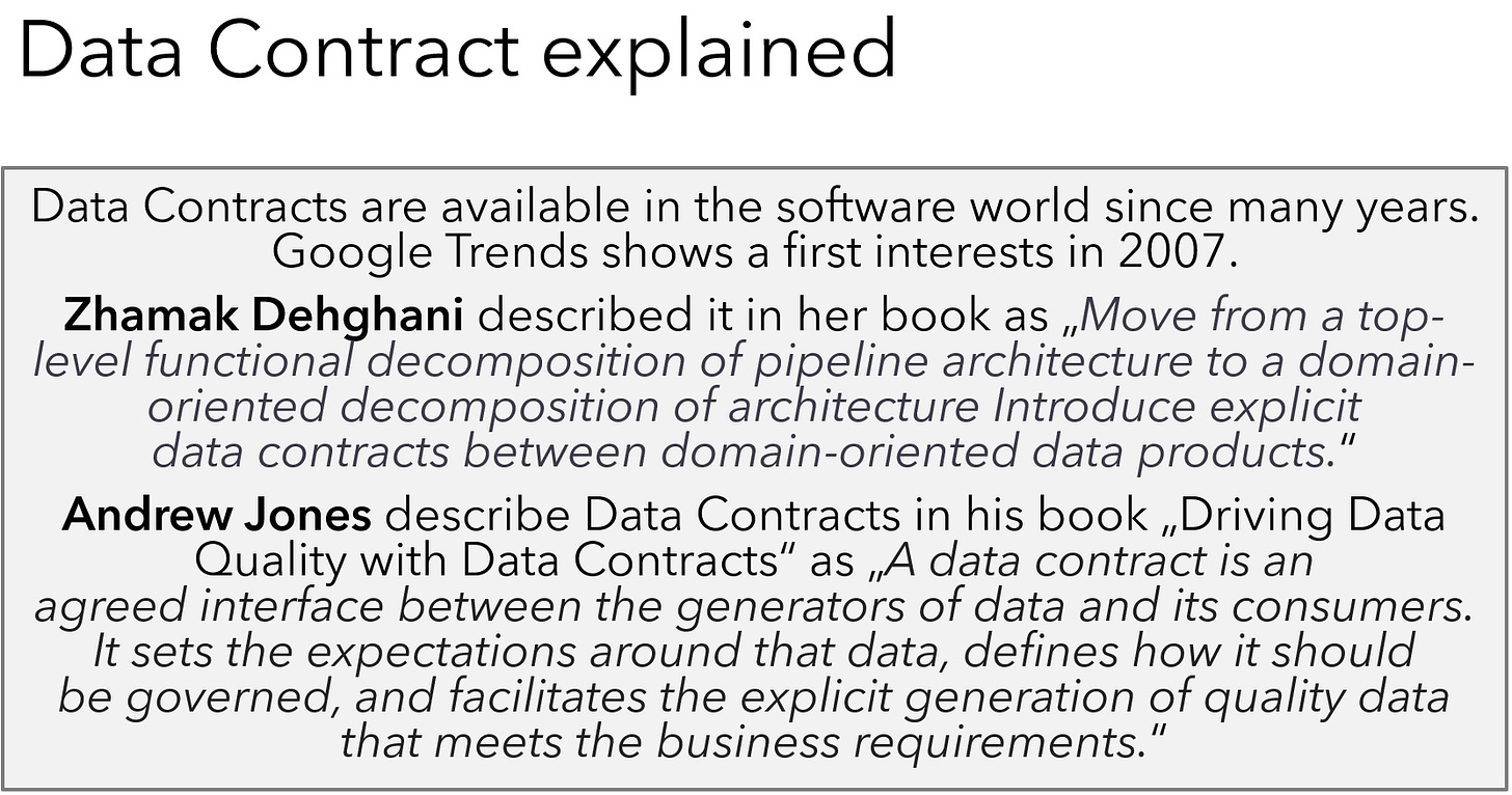 The approach is described as “A set of data contracts governs each data quantum: the primary data contract defines the relationship between the data quantum and its users. It also describes the interoperable model and SLA (service-level agreement) details. This consumer-oriented data contract can also be called output or user data contract.“