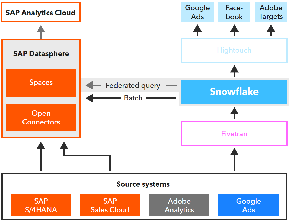 Snowflake Data Cloud proves to be the right solution for integration into the web and cloud environment, and supports marketing and sales through the Snowflake ecosystem integration options via Fivetran (inbound) and Hightouch as Reverse ETL solution (outbound)
