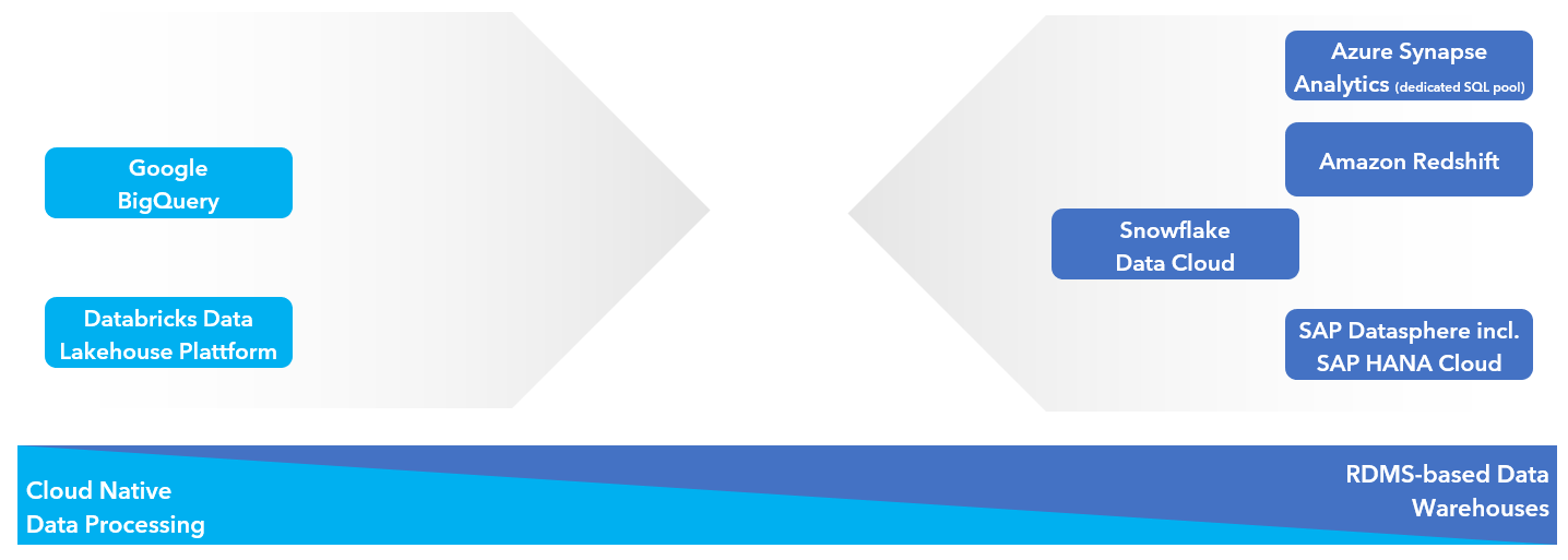 As I understand it, modern cloud data platforms have developed from two directions. From the one side, solutions like Google BigQuery and Databricks Data Lakehouse Platform started cloud native making best use of capabilites in the cloud. Other solutions like Azure Synapse Analytics, Amazon Redshift or SAP Datasphere, based on SAP HANA Cloud, have there orgin in the classical on-premises realm and adapt to cloud native possibilities over time. Snowflake is a little bit different here, as it was completely new designed for the cloud but came somehow from classical Data Warehouse (DWH) thinking.