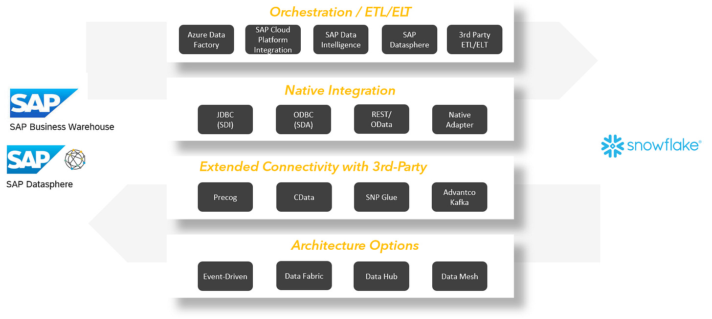 While Snowflake isn’t a official partner with SAP, I see many customers having both solutions in the house and come to the point where they want them to work together. The following picture shows examples of approaches and possibilites discussed in a customer context.