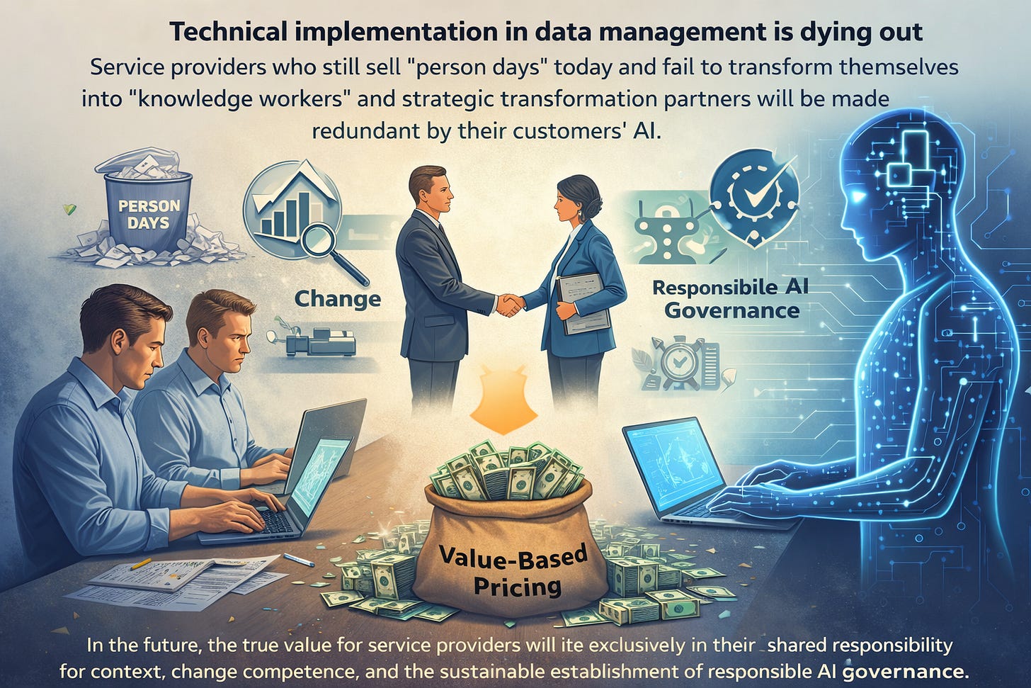In the age of AI, pure âtechnical know-howâ is a commodity. In the future, the true value for service providers will lie exclusively in their shared responsibility for context, change competence, and the sustainable establishment of responsible AI governance. This must be reflected in value-based pricing.